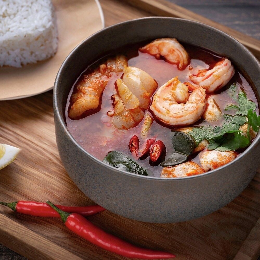 Острый, кисло-сладкий и невероятно ароматный суп с богатым вкусом кокосового молока, лемонграсса, галангала и сочных морепродуктов. Состав: бульон на кокосовом молоке, креветки, кальмары, грибы, лемонграсс, кинза и рис.