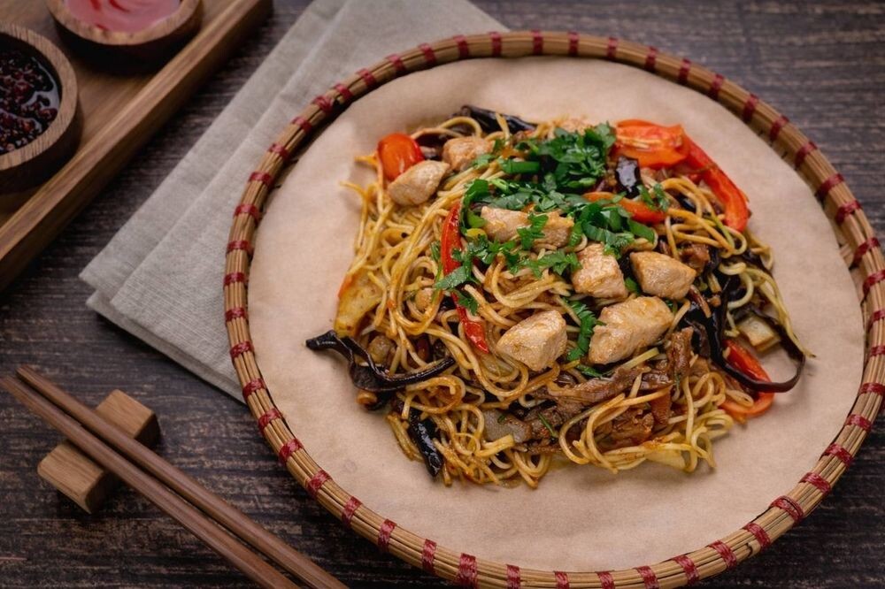 Обжаренная на воке яичная лапша с кусочками курицы, свежими овощами, грибами и фирменным соусом. Ароматное блюдо с лёгкой пикантностью и азиатским характером.