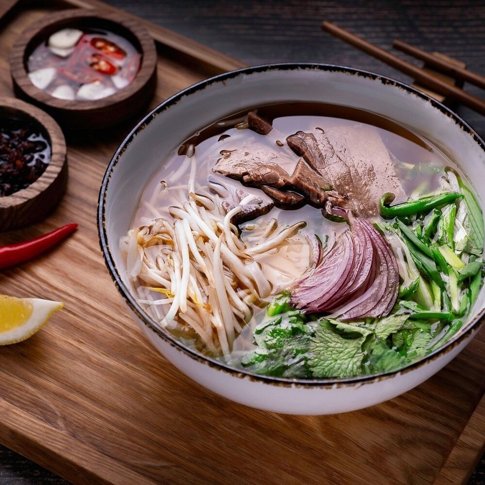 Фо бо — культовое вьетнамское блюдо с насыщенным вкусом и тонким ароматом специй. Готовится на крепком говяжьем бульоне, который томится с имбирём, луком и пряностями. В тарелку добавляют рисовую лапшу, тонко нарезанную говядину, свежие травы и ростки фасоли.