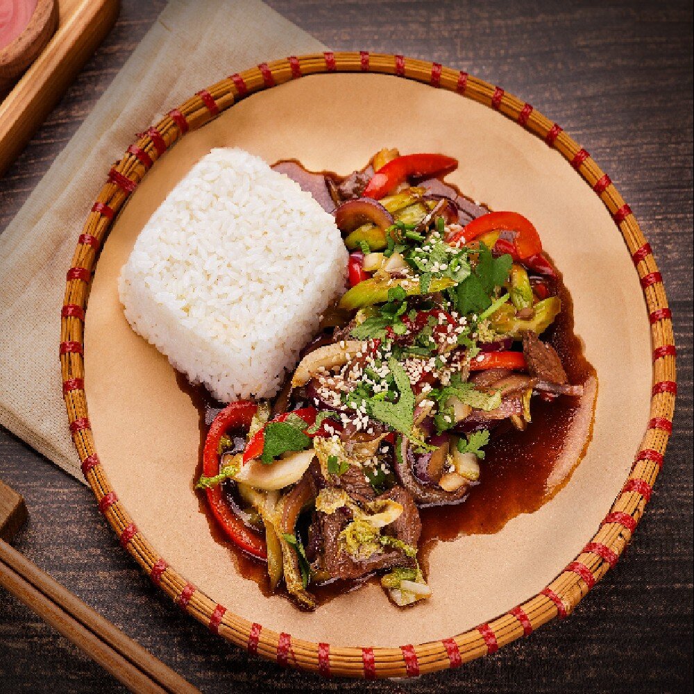 Обжаренная говядина с овощами в ароматном фирменном соусе. Состав: говядина, капуста, болгарский перец, лук и фирменный соус.