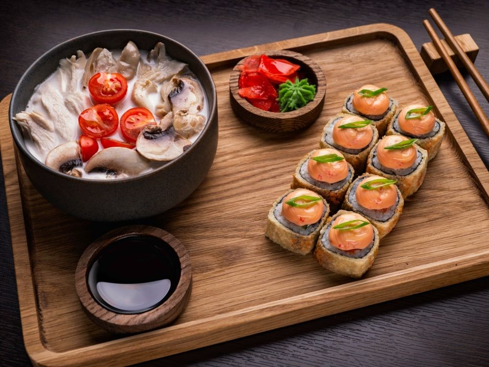 Нежный тайский суп Том Кха и горячие роллы темпура с лососем.