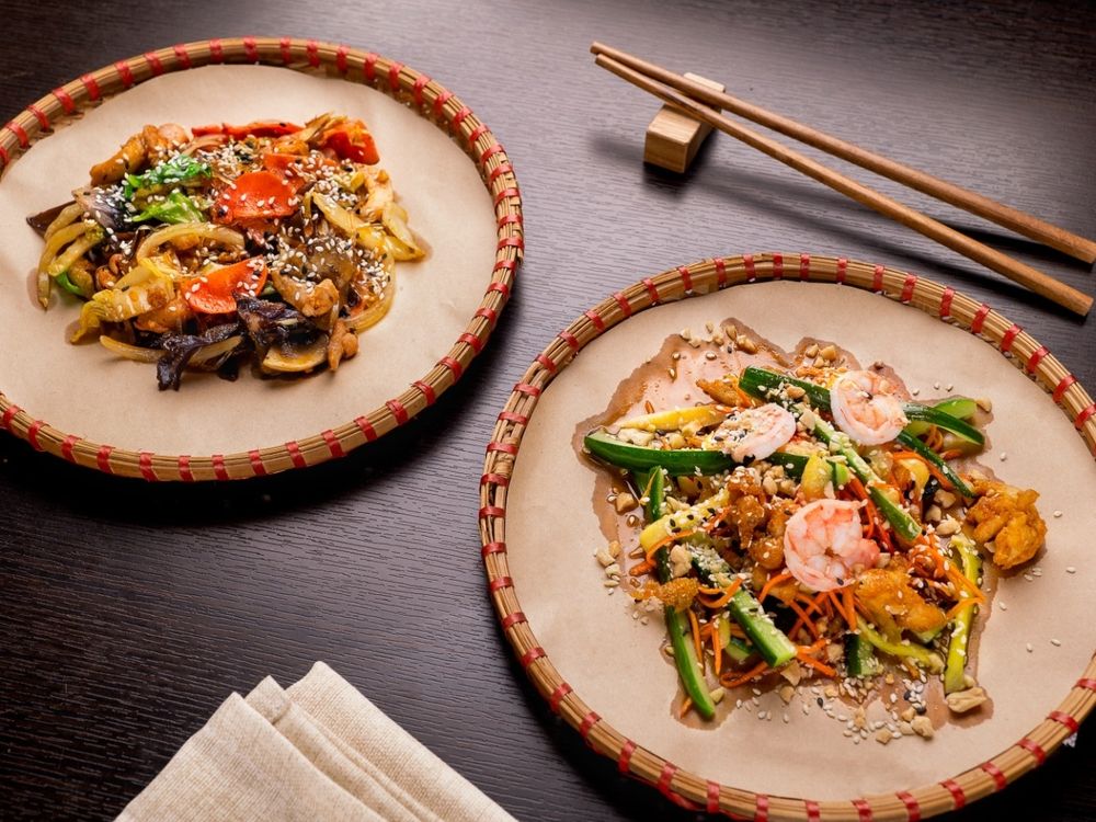 Вок на выбор: Ми Сао Бо (курица/овощи)/ Миен Сао (курица/овощи)/Фо Сао (курица/овощи). Салат на выбор: Соай Бо/Яма Муанг.
