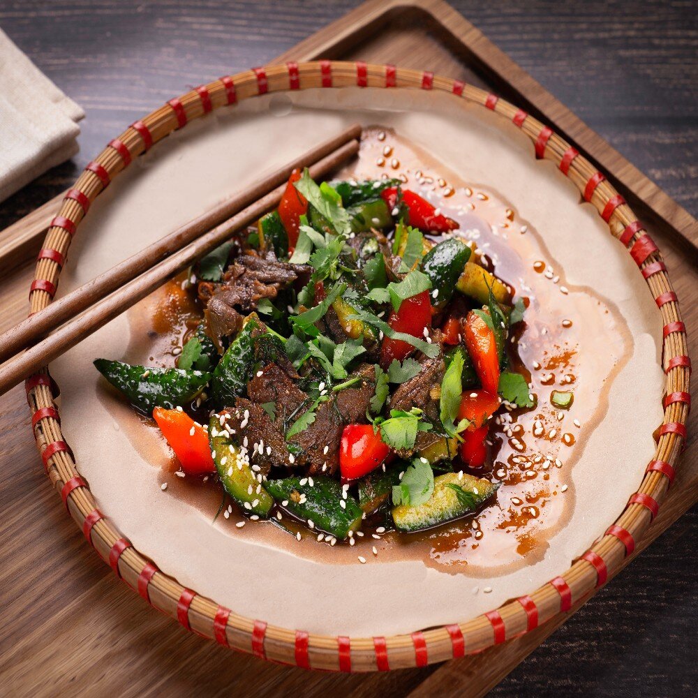 Салат "Соай Бо" с говядиной в пикантном соусе. Состав: говядина, огурцы, морковь, болгарский перец, кинза, кунжут и фирменный соус.