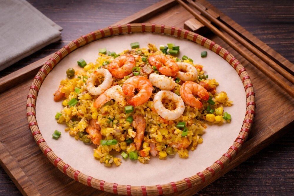 Жареный рис с миксом морепродуктов и овощей. Гармония вкуса моря и восточных специй. Состав: рис, кальмар, креветки, морковь, лук, чеснок, соевый соус, яйцо, специи.
