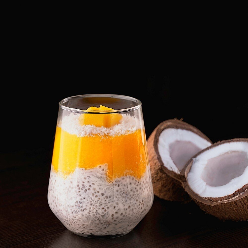 Нежный пудинг на кокосовом молоке с пюре из манго и кокосовой стружкой. Состав: семена чиа, кокосовое молоко, манго, кокосовая стружка.