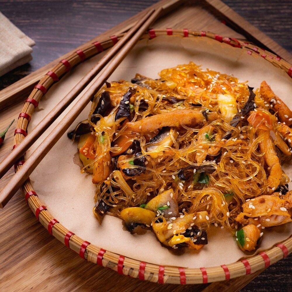 Лёгкое вегетарианское блюдо: обжаренная стеклянная лапша с овощами и соевым соусом. Полезный и сытный выбор. Состав: стеклянная лапша, морковь, болгарский перец, лук, фирменный соус, кунжут, зелень.