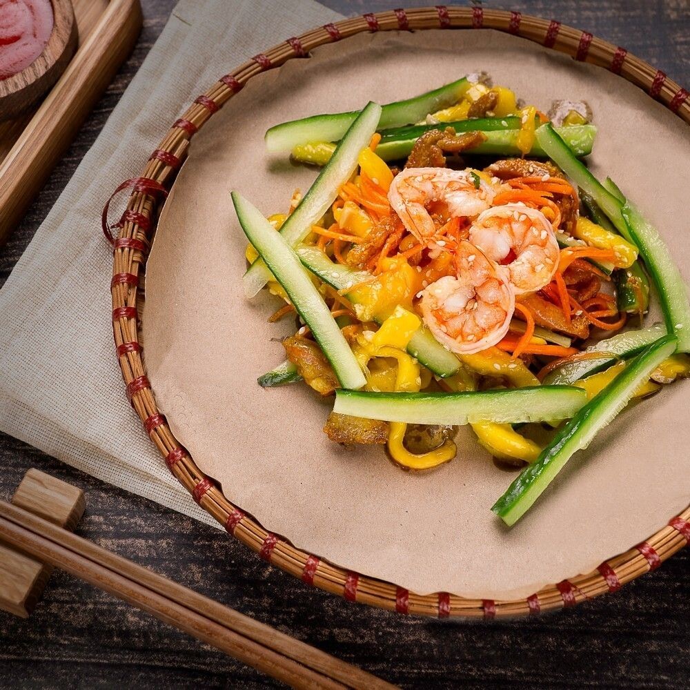 Легкий салат с курицей, морепродуктами и манго. Состав: курица, креветки, манго, морковь, кинза, кунжут, арахис и фирменный соус.