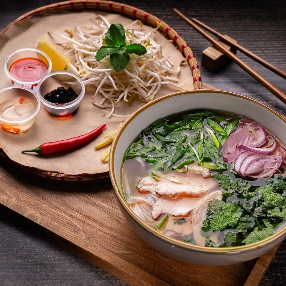 Лёгкий вьетнамский суп на курином бульоне с рисовой лапшой и травами. Ароматное и питательное блюдо. Состав: курица, рисовая лапша, куриный бульон, лук, имбирь, лайм, кинза, мята, ростки фасоли, острый перец, рыбный соус.